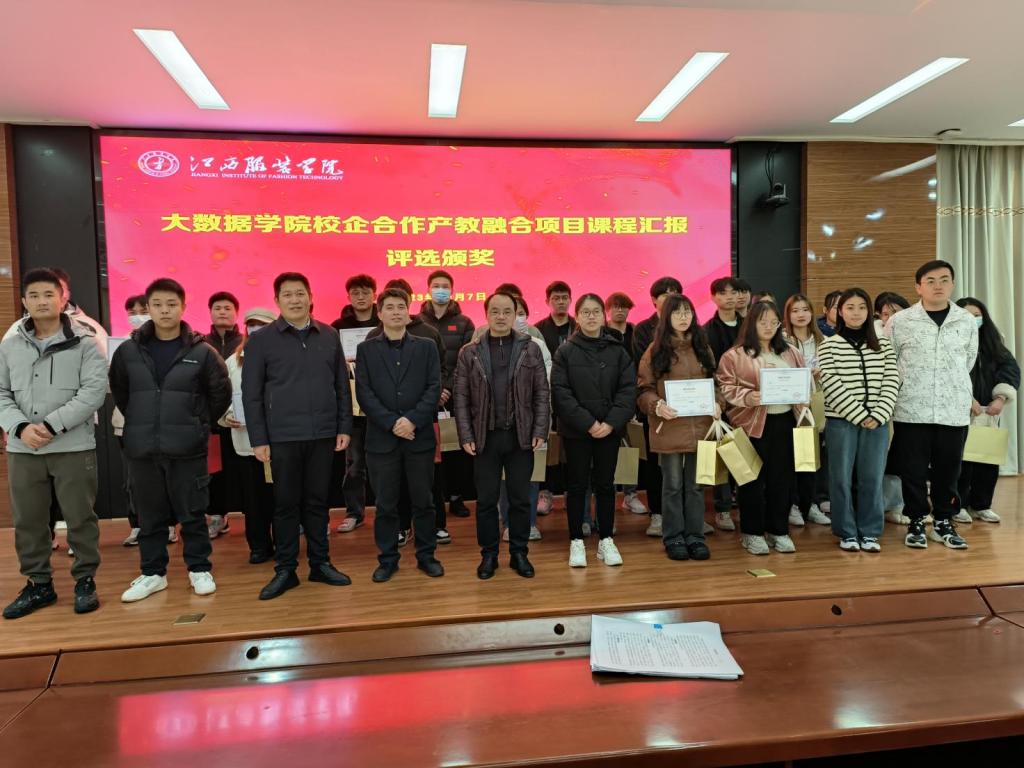 项目课程汇报结束后,于2023年11月7日下午,milan米兰官网在行政楼报告厅举行了校企合作产教融合项目课程汇报的评选颁奖大会,从三个班共计19个组中选取出一等奖1名、二等奖2名、三等奖3名以及优胜奖4名,并对获奖小组的所有成员颁发奖品。参与本次颁奖仪式的人员有学院院长徐照兴、副院长赵德福、教研室主任吴琴琴、企业导师、及各班教师和全体学生。在颁奖结束之后,全体参会人员进行合影留念。