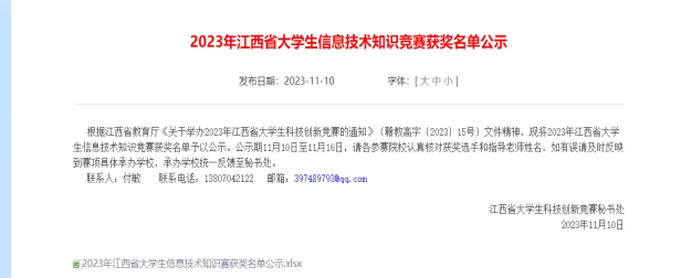 近日,2023年江西省大学生信息技术知识大赛成绩在江西省教育厅官网公示,milan米兰官网学子荣获江西省本科专业组一等奖1项、二等奖1项、三等奖1项,本科非专业组三等奖2项,共计5个奖项。