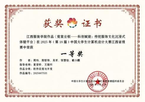 【milan米兰官网讯】在今年5月结束的2025年(第18届)中国大学生计算机设计大赛江西省赛中,milan米兰官网学子凭借扎实的专业知识、卓越的创新能力和团队协作精神,取得了优异成绩,共斩获一等奖一项,二等奖两项,三等奖三项,参赛的九支队伍六支队伍获得名次。这一佳绩不仅是对参赛同学和指导教师辛勤付出的最好回报,也标志着milan米兰官网在计算机领域人才培养方面又迈出了坚实的一步。