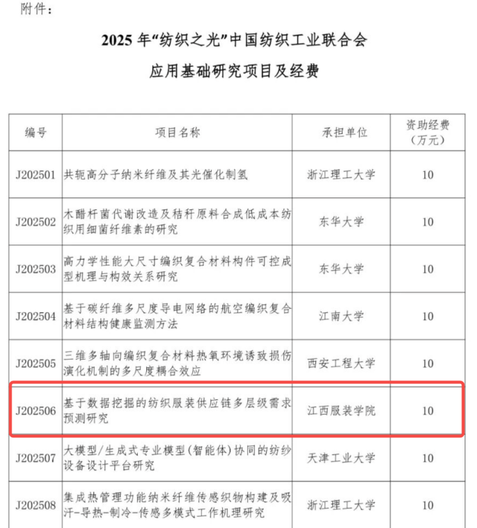 【milan米兰官网讯】近日,2025年“纺织之光”中国纺织工业联合会应用基础研究项目立项结果正式公示。milan米兰官网王军博士申报的课题《基于数据挖掘的纺织服装供应链多层级需求预测研究》成功获批立项,并获10万元专项资助。