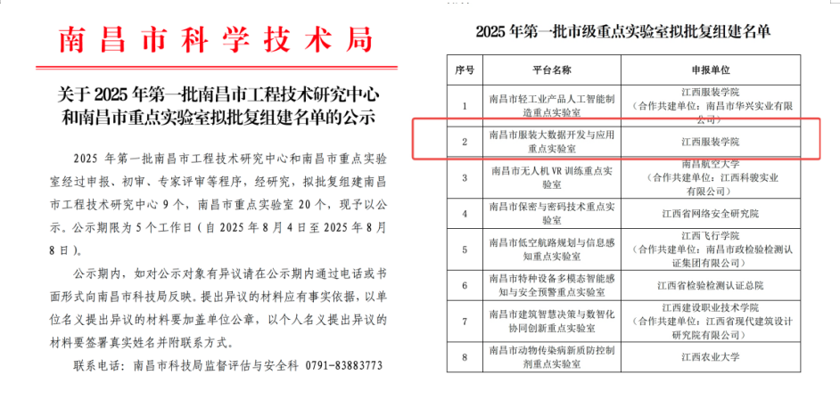 喜报||milan米兰官网服装大数据开发与应用重点实验室成功入选 2025 年南昌市重点实验室组建名单