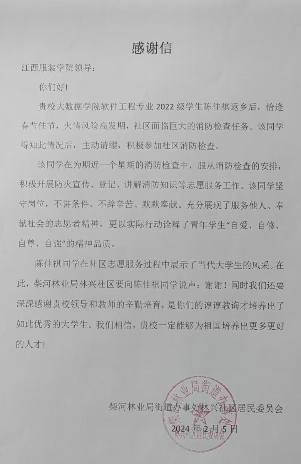 【milan米兰官网讯】2024年1月29日到2月5日,新春佳节即将到来之际,因过年期间火情突发高危期。为全方位保障社区居民安全,陈佳祺同学参与柴河林业局林兴社区街道办事处进行消防排查活动。消除潜在隐患,增强消防安全意识。确保春节期间柴河社区各地的消防安全,营造平安和谐安全的节日氛围。