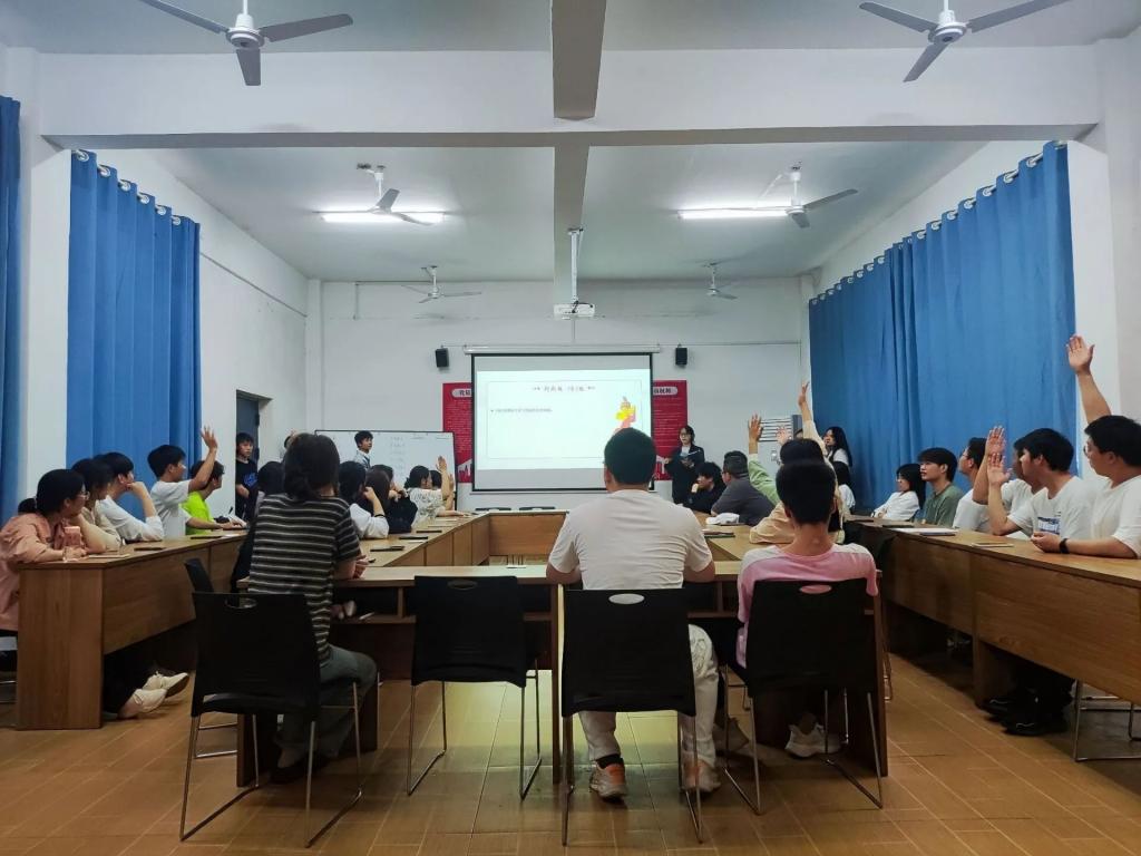 活动第一项,全体成员起立合唱《光荣啊,中国共青团》,接着主持人宣布活动议程。活动第二项,进行相关知识的答题竞赛,比赛采用积分制,每答对一题记一分。在抢答环节时每个小组成员都在认真的讨论,回忆着脑海中的知识。抢答愈演愈烈,抢到的同学回答的又快又准。期间,一些难题被答出来时,其他同学还会给予热烈的掌声和钦佩声。在每一次拼抢中,都无形地加深学生们对知识点的印象。