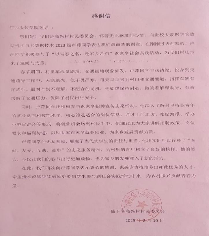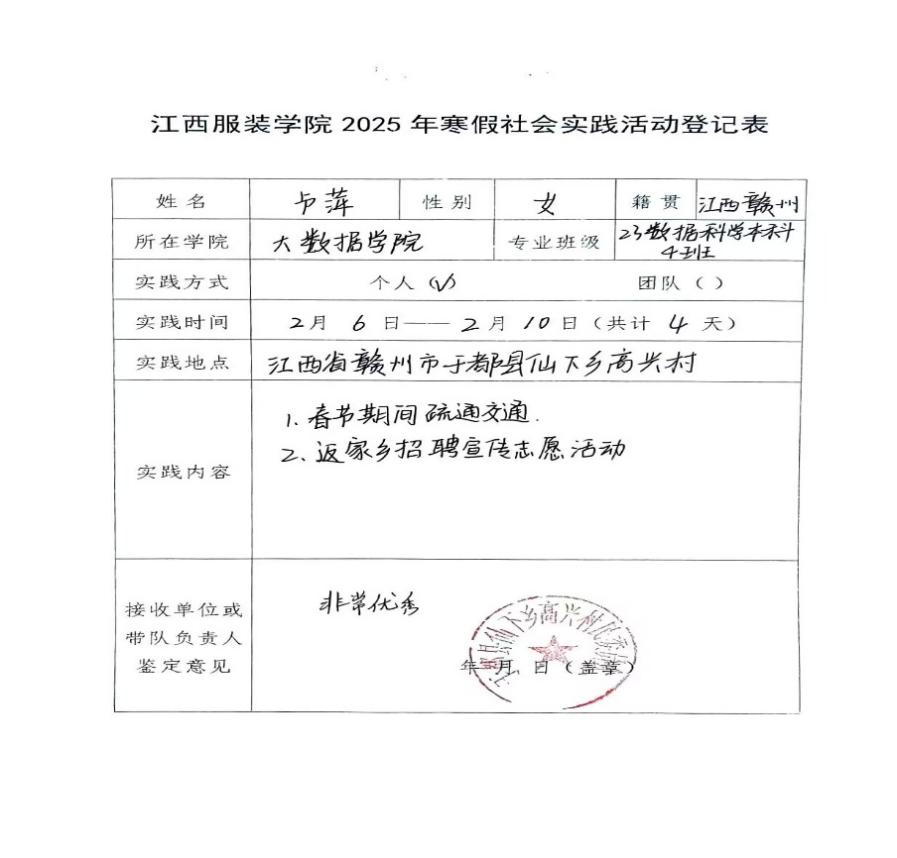 “时代呼唤担当,民族振兴是青年的责任。”在这个寒假,卢萍同学积极响应时代的号召,在家乡赣州市于都县仙下乡高兴村参加了“以青春之名,赴家乡之约”返家乡社会实践活动。这段经历,不仅让她收获了宝贵的经验,也让她深刻体会到了作为青年一代,肩负的责任与使命。