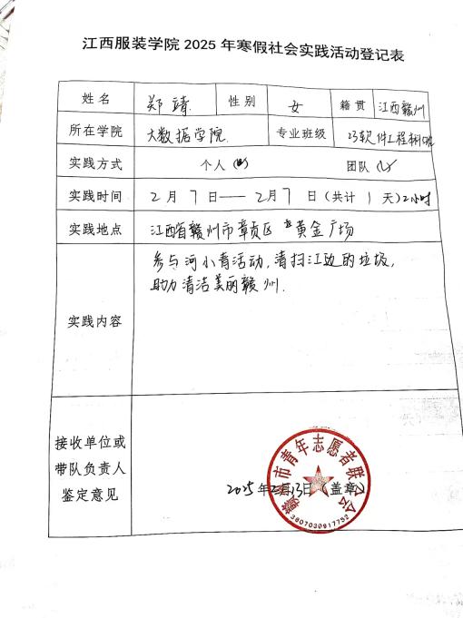 “时代在召唤担当,民族的振兴寄望于青年的肩头。”在这个寒假,郑靖积极响应时代的号召,投身于江西省赣州市章贡区黄金广场举办的“河小青”活动,致力于家乡水域的保护事业,身体力行地践行着青年的责任与使命。