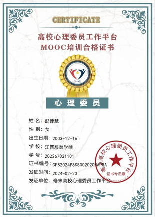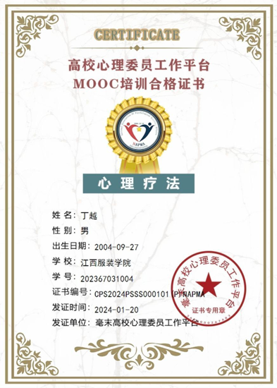本次心理委员MOOC培训,共计14个专题:心理委员角色定位、常见心理问题识别与处理、心理危机预防和干预、学习问题的应对、恋爱问题的应对、职业生涯规划和就业问题等。通过观看公众号上提供的心理学习视频,进行自主学习和总结并完成培训的平时测试或考核,获取心理委员证书或心理疗法证书。