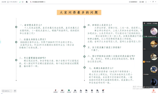 在答疑环节,王煊毅学长针对政审、应届生身份、培训班选择等高频问题逐一分析:明确政审一般查本人、部分岗位查两代或三代;2026届应届生限定当年7月毕业生,毕业2年内未缴社保(部分省份缴社保也可)可保留应届生身份;笔试建议以自学为主,自制力较弱者可报班,面试则推荐有针对性地报班。此外,王学长还详解了四项人员、基层工作经验、选调生选拔等政策细节,解答考生备考全周期的疑问。