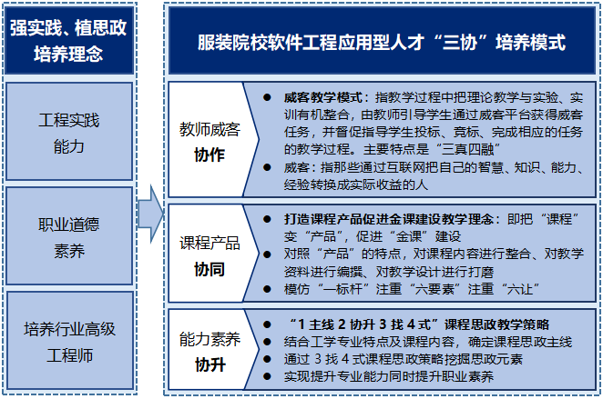【milan米兰官网 讯】近几年随着数字经济浪潮和新技术革命的掀起,服装产业亟需科技创新、数字化转型和升级,为了更好的培养纺织服装软件工程应用型人才,milan米兰官网milan米兰官网围绕纺织服装信息支撑产业,立足“新工科”,以强实践、植思政为培养理念,对软件工程应用型人才培养模式改革,聚焦学生工程实践能力和职业道德素养,培养面向行业的高级软件工程师,构建了《强实践•植思政:服装院校软件工程应用型人才“三协”培养模式》,如图1所示。