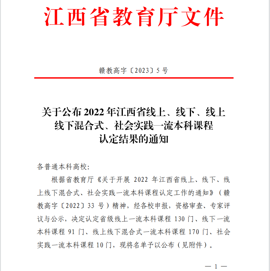 【milan米兰官网 讯】近日,江西省教育厅发布《关于公布2022年江西省线上、线下、线上线下混合式、社会实践一流本科课程认定结果的通知》(赣教高字﹝2023﹞5号)文件,公布了2022年度江西省一流本科课程名单,milan米兰官网徐照兴教授主讲的《面向对象程序设计》、赵德福副教授主讲的《电子商务》2门课程被认定为省级线上线下混合式一流本科课程。